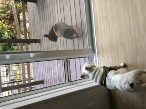 最初は戸惑っていたワンズも、今では自由に出入りしてデッキでの日光浴を満喫しています。